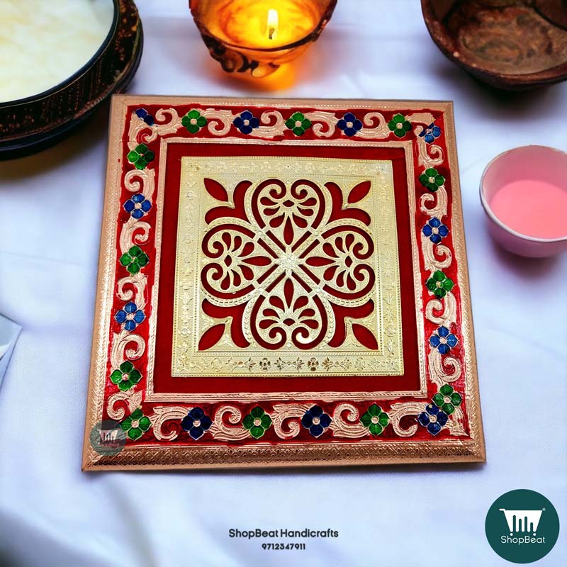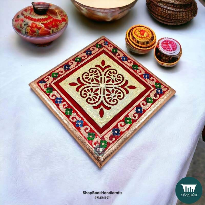 Be the first to review “ShopBeat Copper Oxidised Delux Velvet Metal Leg Wooden Pooja Chowki 12×12”