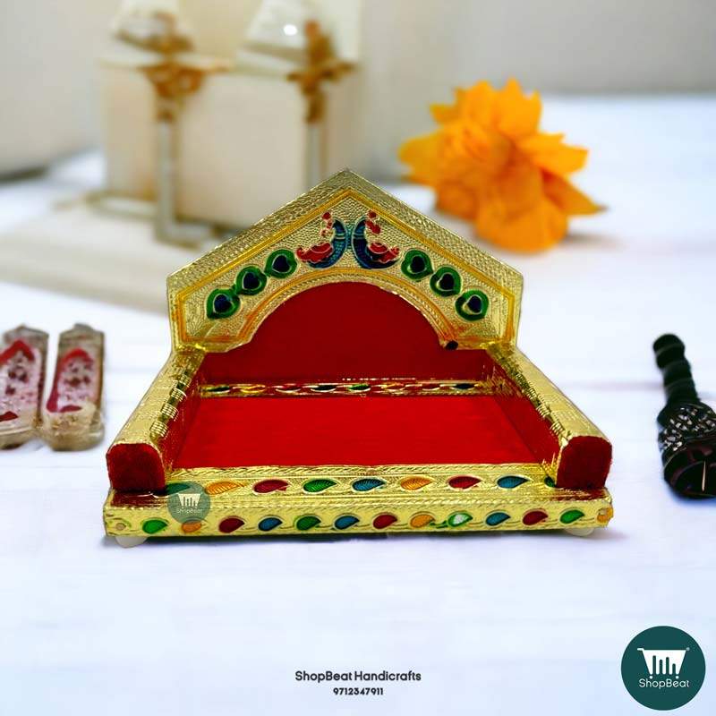 ShopBeat Golden Meenakari Peacock Design Laddu Gopal Wooden Singhasan 4 No. 6×4 inch